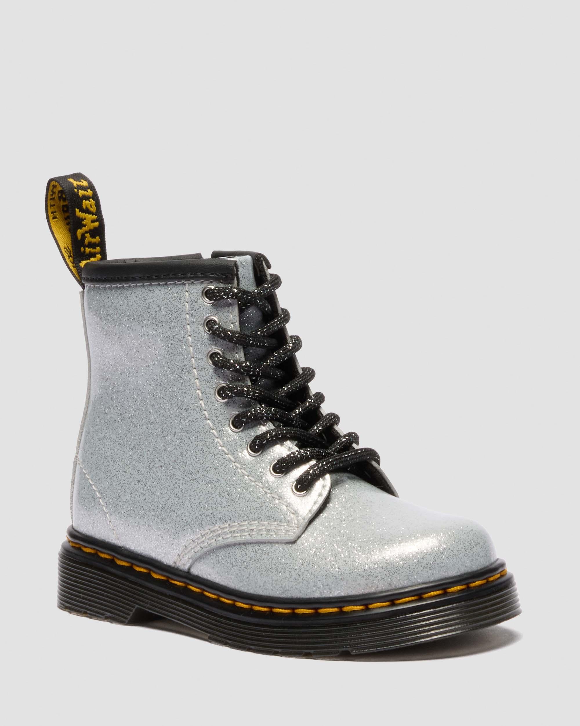 Den originale DM's støvle – med glimmer til små fødder. Dette fornyede design er skabt til personligheder, der skinner i en tidlig alder. Den er lavet med Nebula Glitter, et klassisk laklæder med en højglansfinish og en funklende effekt. Modellen har alle de karakteristiske funktioner, du forventer af en 1460-støvle med 8 snørehuller: en hælstrop med DM's signatur og en gul imiteret welt-syning. Og så er der de skinnende sølvfarvede snørehuller, en indvendig lynlås og en cementeret røgfarvet DM's sål til børn.